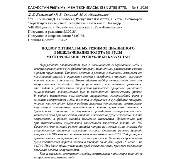 Ключевые слова: золотомедные руды, оптимальные параметры, цианидное выщелачивание, золото, медь.