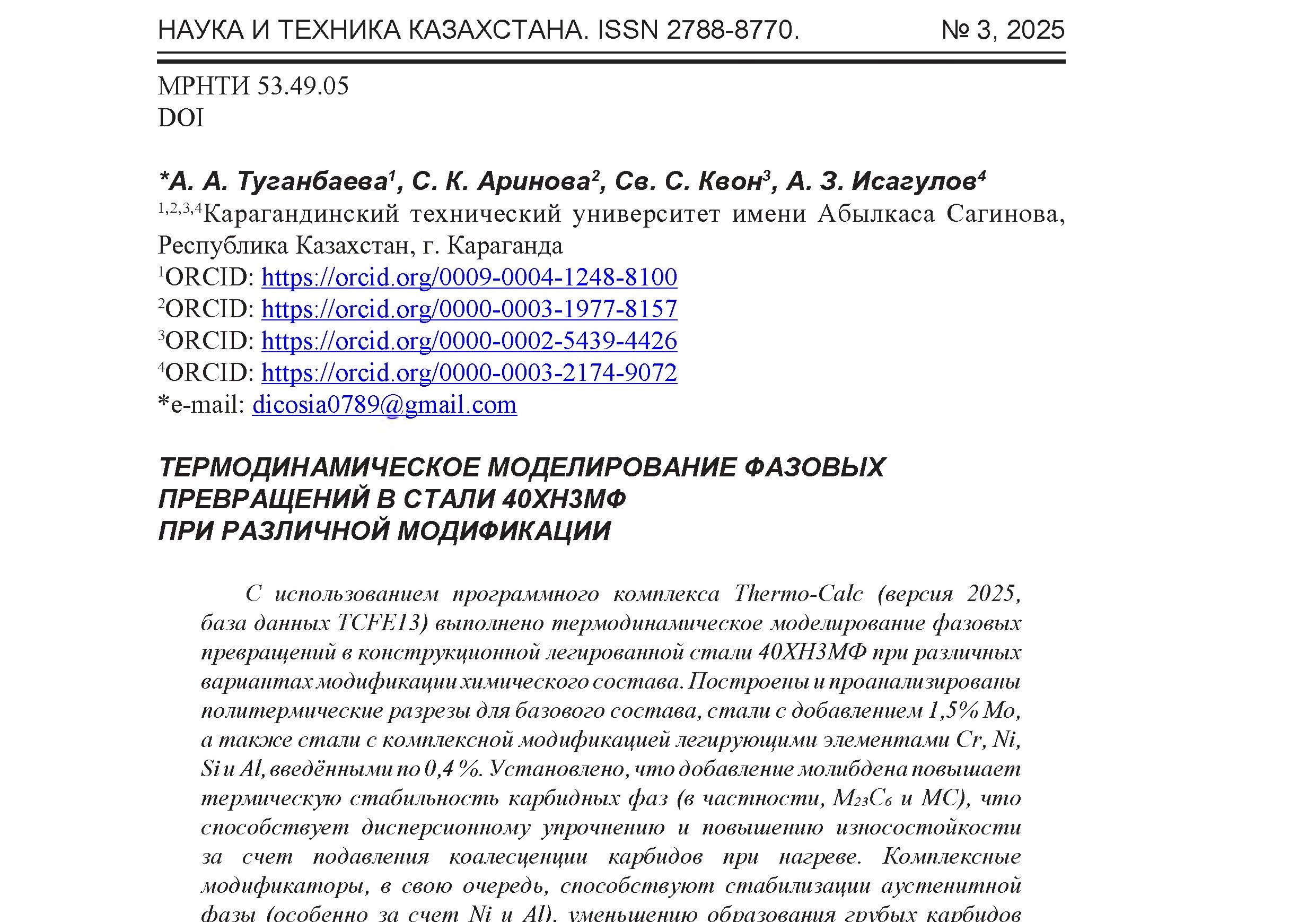 С использованием программного комплекса Thermo-Calc (версия 2025, база данных TCFE13) выполнено термодинамическое моделирование фазовых превращений в конструкционной легированной стали 40ХНЗМФ при различных вариантах модификации химического состава. Построены и проанализированы политермическиеразрезы для базового состава, стали с добавлением 1,5%Мо, а также стали с комплексной модификацией легирующими элементами Сг, Ж, Si и А1, введёнными по 0,4 %. Установлено, что добавление молибдена повышает термическую стабильность карбидных фаз (в частности, М2зСв и МС), что способствует дисперсионному упрочнению и повышению износостойкости за счет подавления коалесценции карбидов при нагреве. Комплексные модификаторы, в свою очередь, способствуют стабилизации аустенитной фазы (особенно за счет Ж. и А1), уменьшению образования грубых карбидов и интерметаллических соединений, а также повышению пластичности сплава благодаря гомогенизации структуры. Проведённый анализ фазовых превращений позволил точно определить температурные диапазоны полной аустенитизации и растворения основных карбидных фаз, что создаёт основу для оптимизации режимов термической обработки (включая температуру закалки и отпуска) с целью получения мелкозернистой, прочной и однородной структуры. Результаты моделирования могут быть использованы при проектировании составов сталей и технологий термической обработки для повышения их эксплуатационных свойств в ответственных узлах.